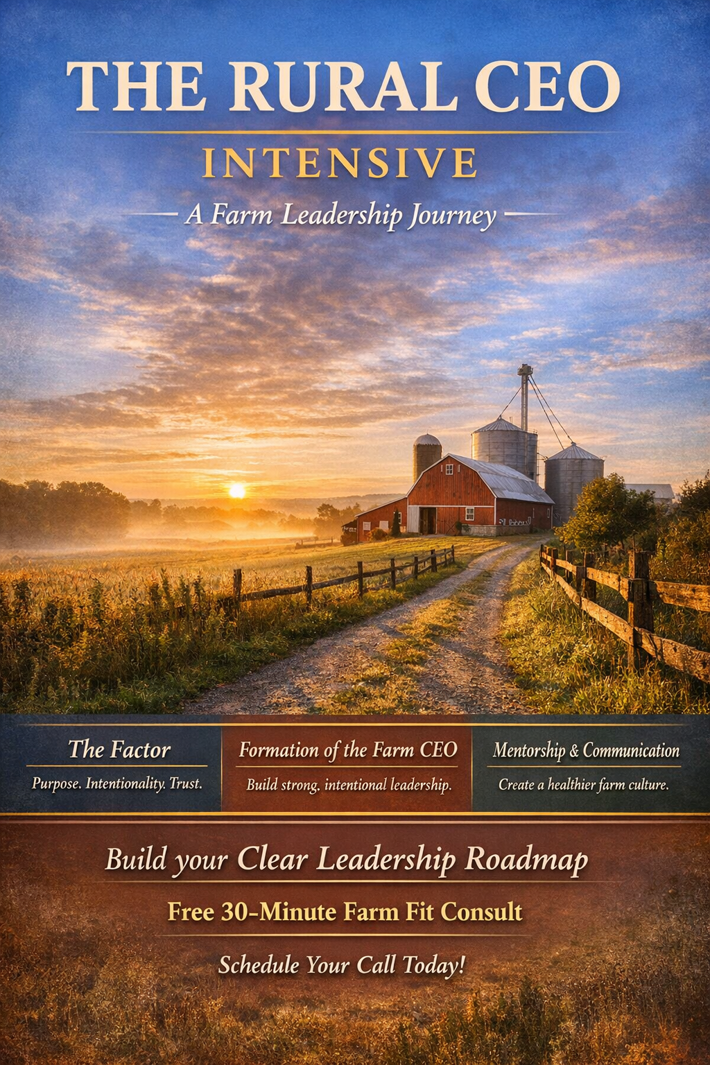 At the center of this process is The Factor — Purpose, Intentionality, and Trust. These three elements form the foundation of an intentional Rural CEO. From that foundation, the work turns to the formation of the Farm CEO: a leader who can take ownership, communicate clearly, mentor well, and help shape a healthier culture for the future of the farm.